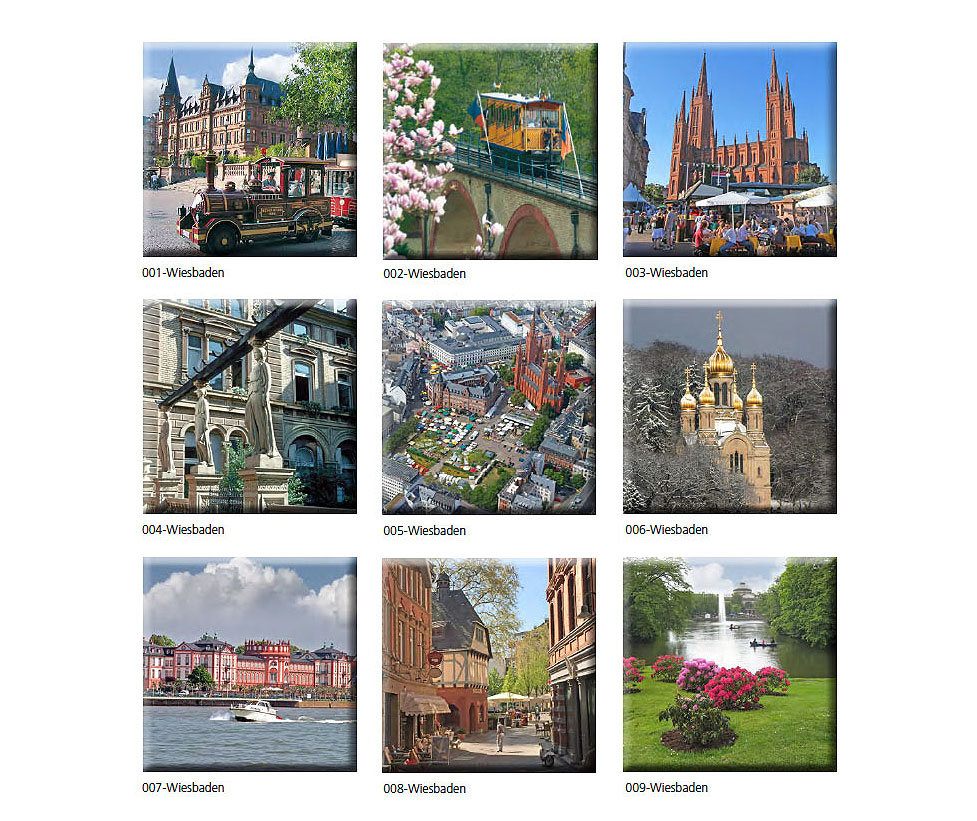 auf Naturholz Rahmen. Motive Wiesbaden, Stückpreis 24, Euro, inkl. MwSt. Bestellung nach Nr., andere Größen oder Motive auf Anfrage. |