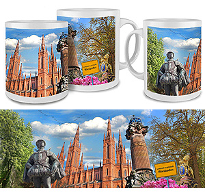 Fototasse Marktkirche Wiesbaden, brillant gedruckte Collage von Kirche und Umfeld. Ein Gastgeschenk mit großem Erinnerungswert. |