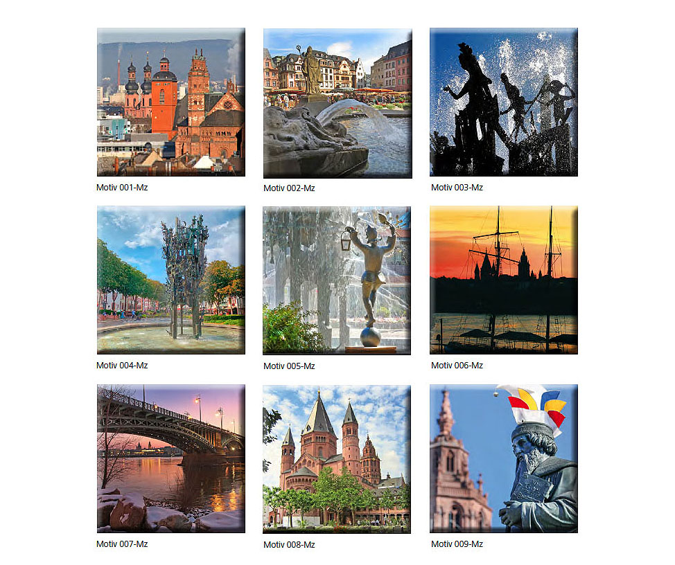 auf Naturholz Rahmen. Motive Mainz am Rhein, Stückpreis 24, Euro, inkl. MwSt. Bestellung nach Nr., andere Größen oder Motive auf Anfrage. |