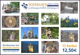 ![]() Postkarten-Set Wiesbaden, Russische Kirche 12 hochwertige Ansichtskarten Preis 12,50 € inkl. MwSt. und Versand. |
